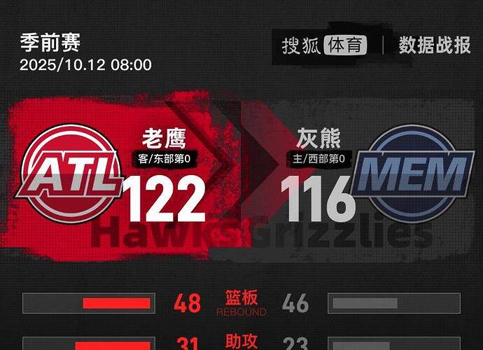 北京时间10月12日NBA季前赛,客场作战的鹰以122-116击败灰熊。约翰逊20分7篮板2助攻,阿尔达马10分10篮板4助攻。