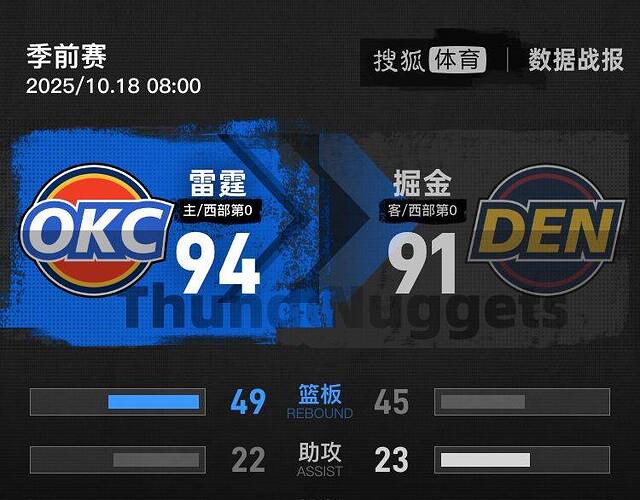 北京时间10月18日NBA季前赛,主场作战的雷霆以94-91击败掘金。吉昂17分4篮板1助攻,沃特森15分6篮板4助攻。